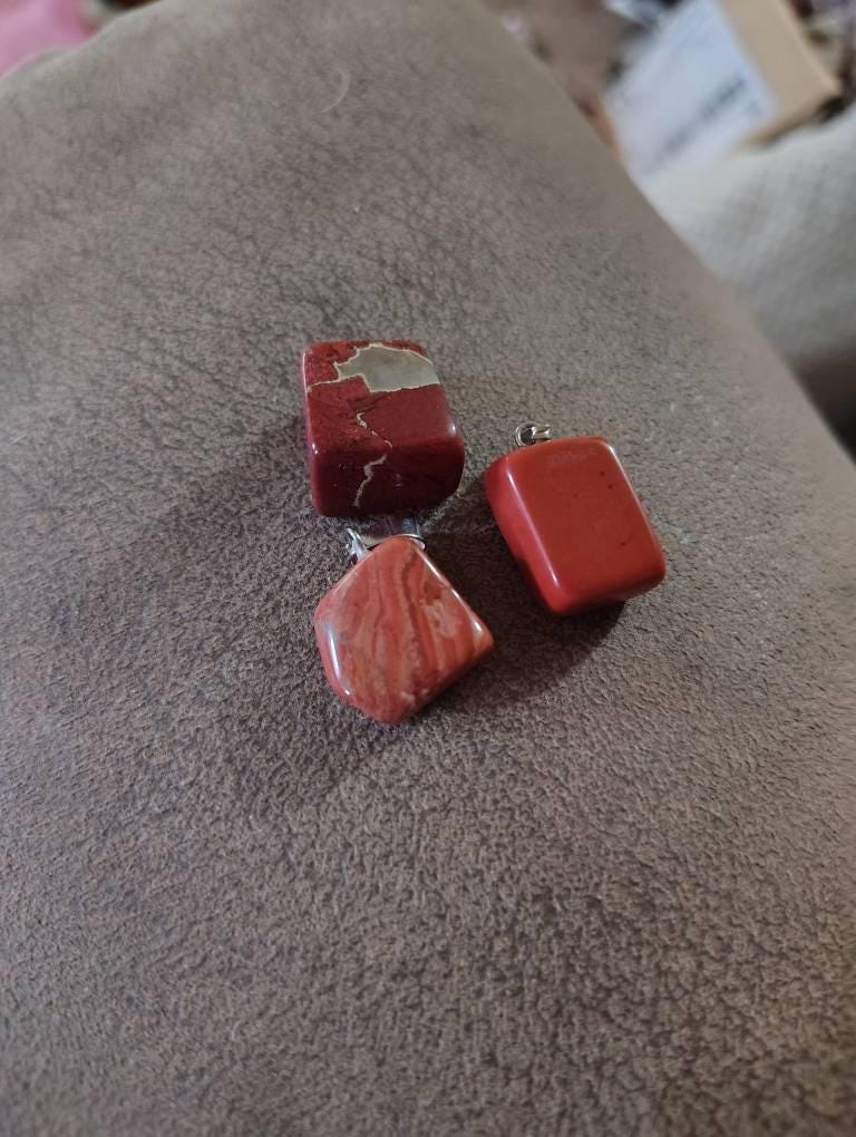 This listing is for a beautiful natural Red Rainbow Jasper and Stainless Steel pendant. Each nugget shaped pendant is made with carefully and skillfully hand cut polished stone with a stainless steel snap on bail. Each pendant is 15-35x10-20x5-15mm in size with a 3x7.5mm hole. These beautiful pendants include a silver color metal loop making it perfect for easy jewelry making.
