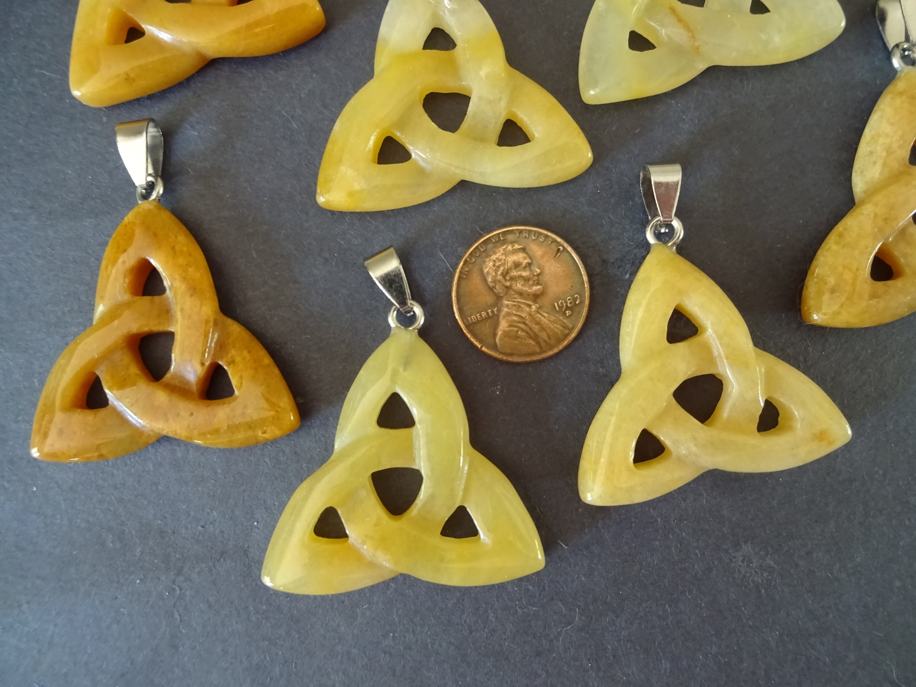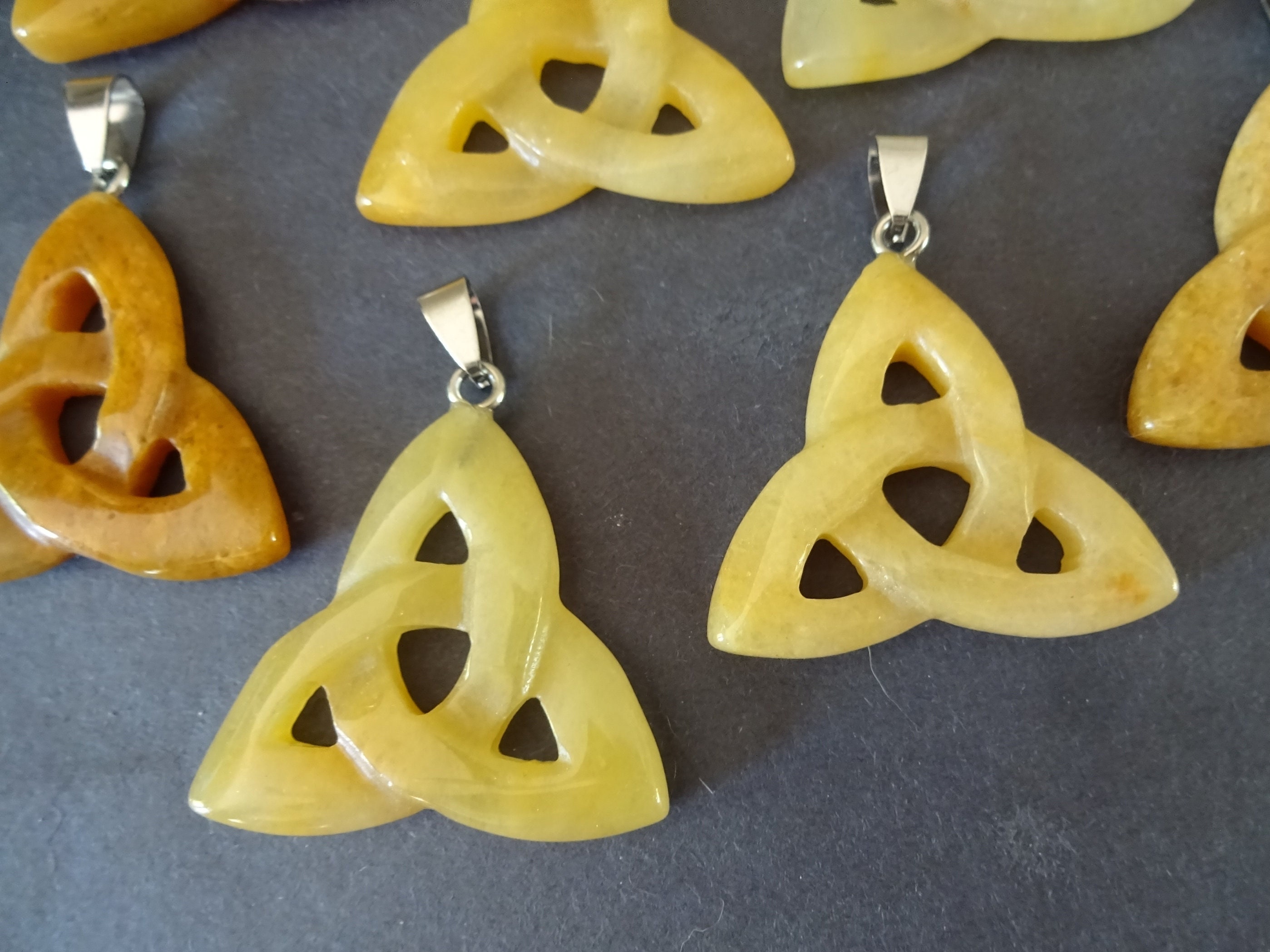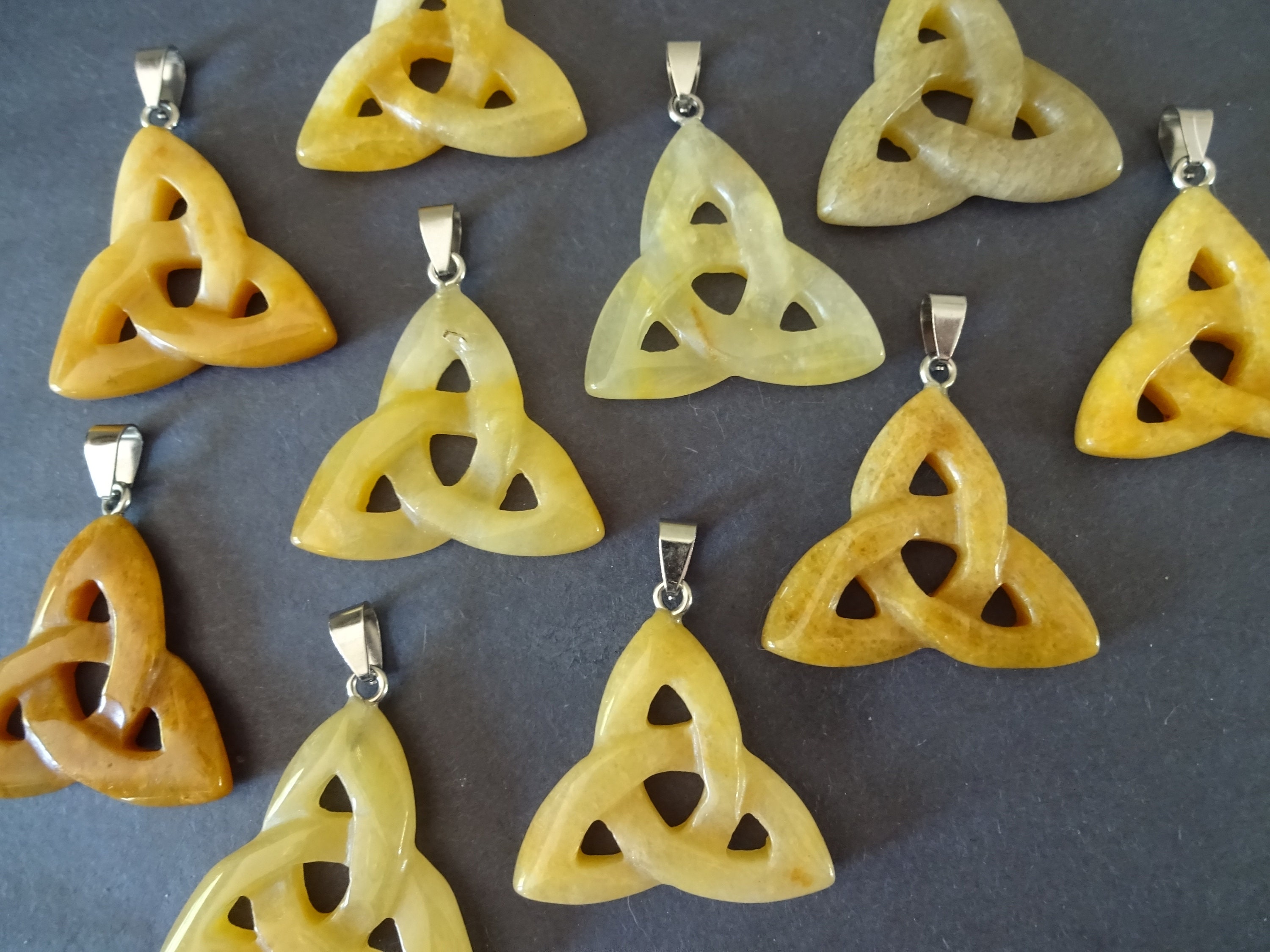 This listing is for a beautiful Natural Topaz Jade and Stainless Steel trinity knot pendant. Each 23-40x33-38x5-7mm pendant is carefully and skillfully shaped and polished. These stone pendants feature a lovely yellow semi-transparent color and an Irish triquetra trinity knot design.