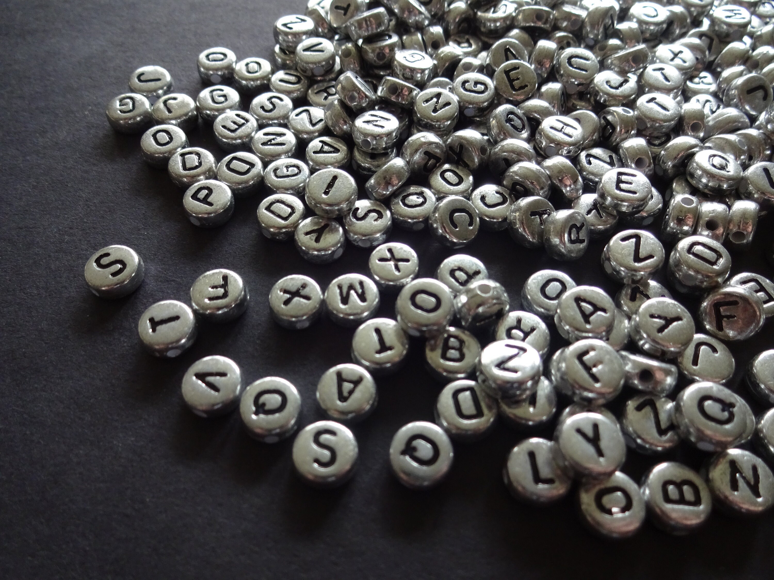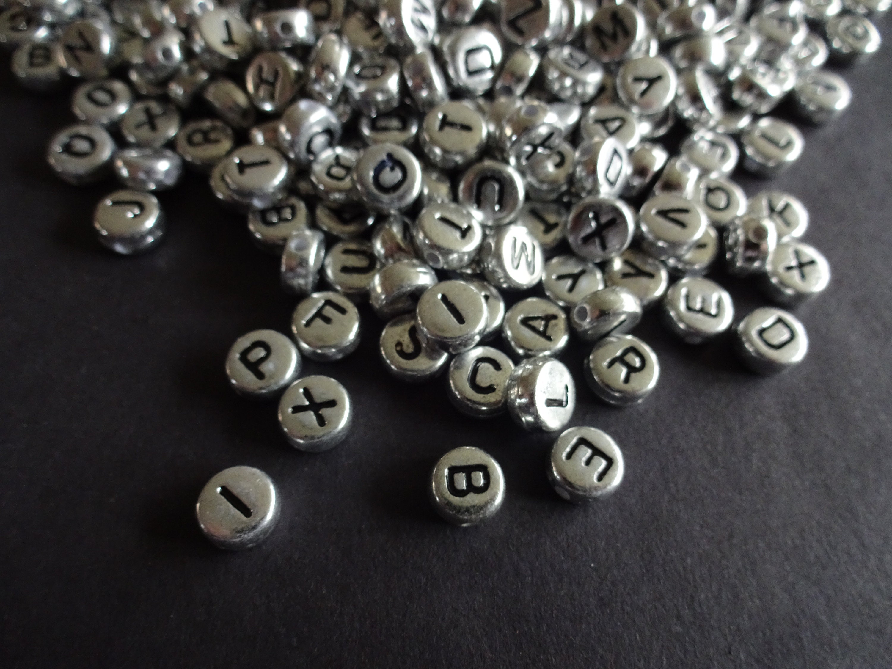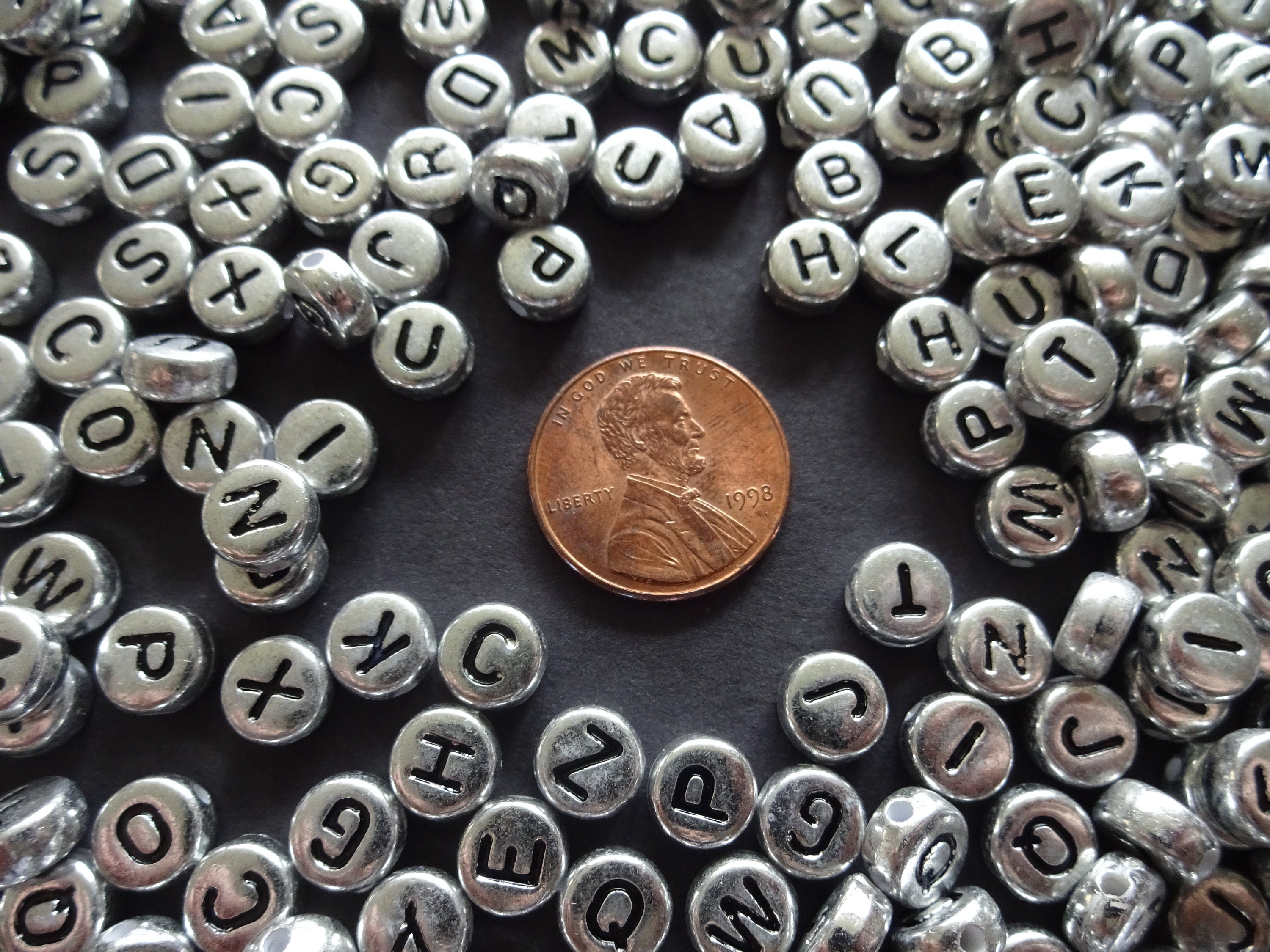 This listing is for a mix of 7x3.5mm acrylic letter beads. In each order you will receive a mixed lot of silver color alphabet beads. These beads are great for mixing and matching to create your own perfect design. They are also great for arts and crafts projects and friendship bracelets.