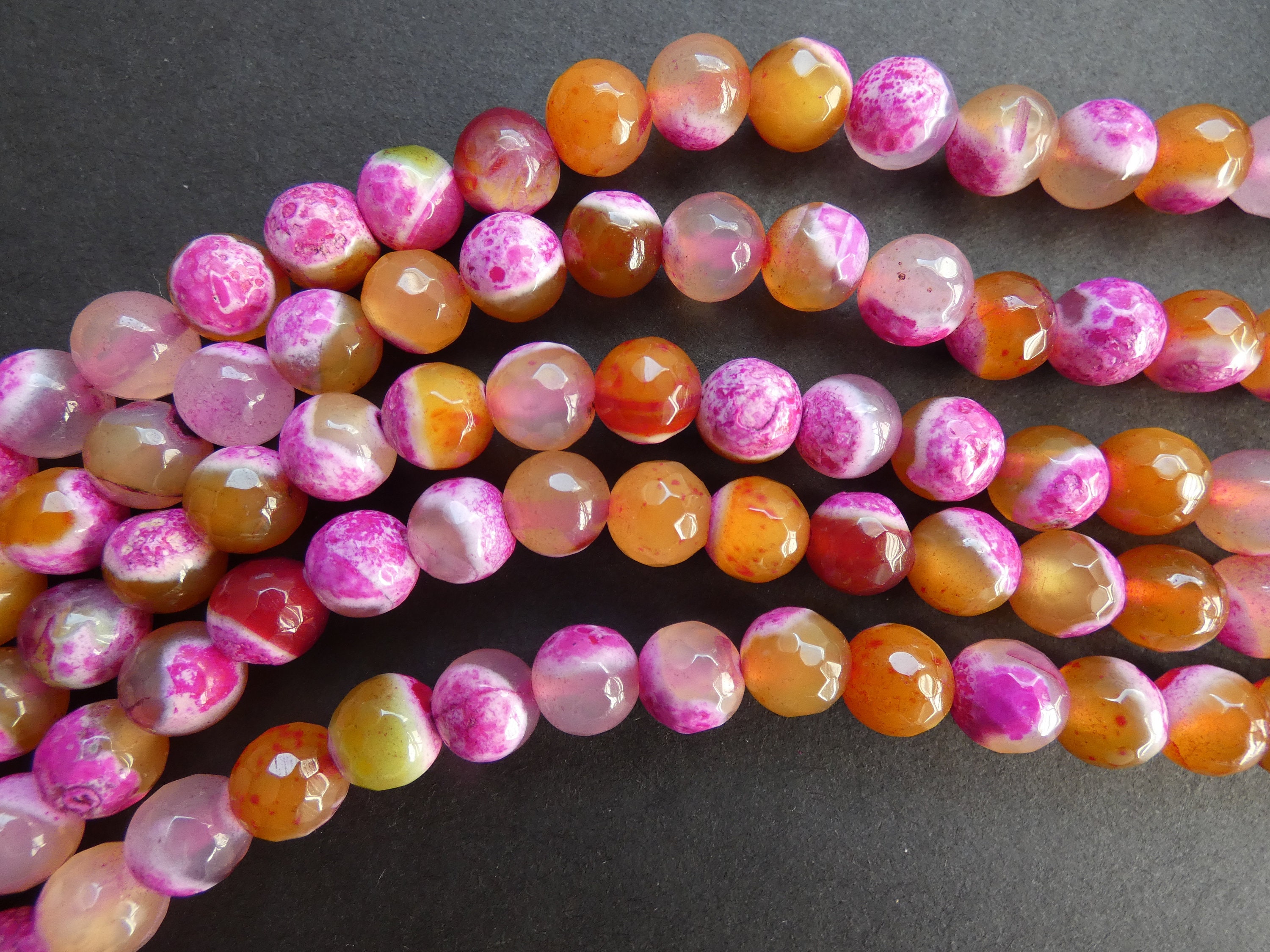 8mm Natural Fire Agate Faceted Bead Strand, Yellow and Pink, Dyed and Heated, About 47 Beads, 15 Inch Strand, Ball Bead, Round, Faceted