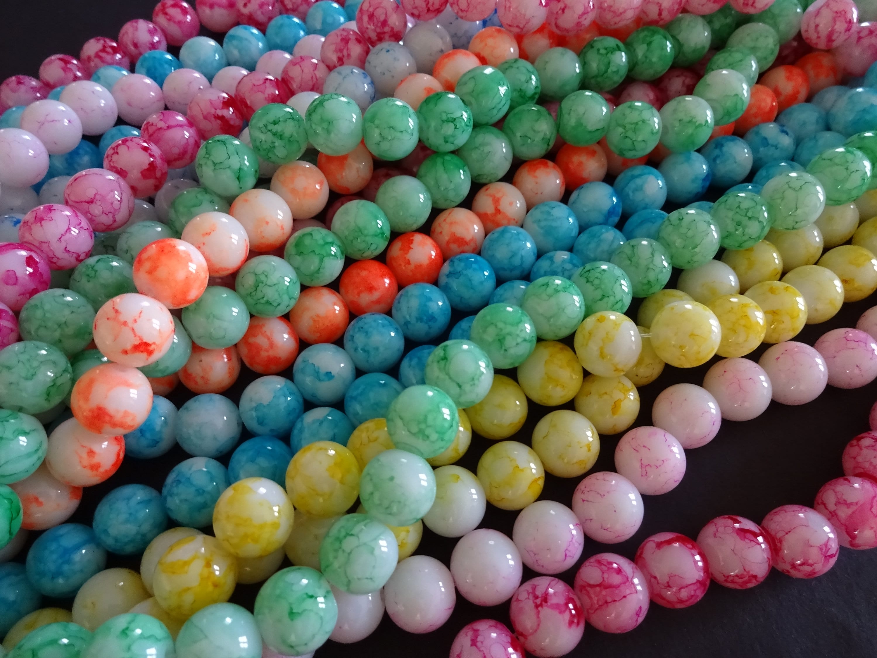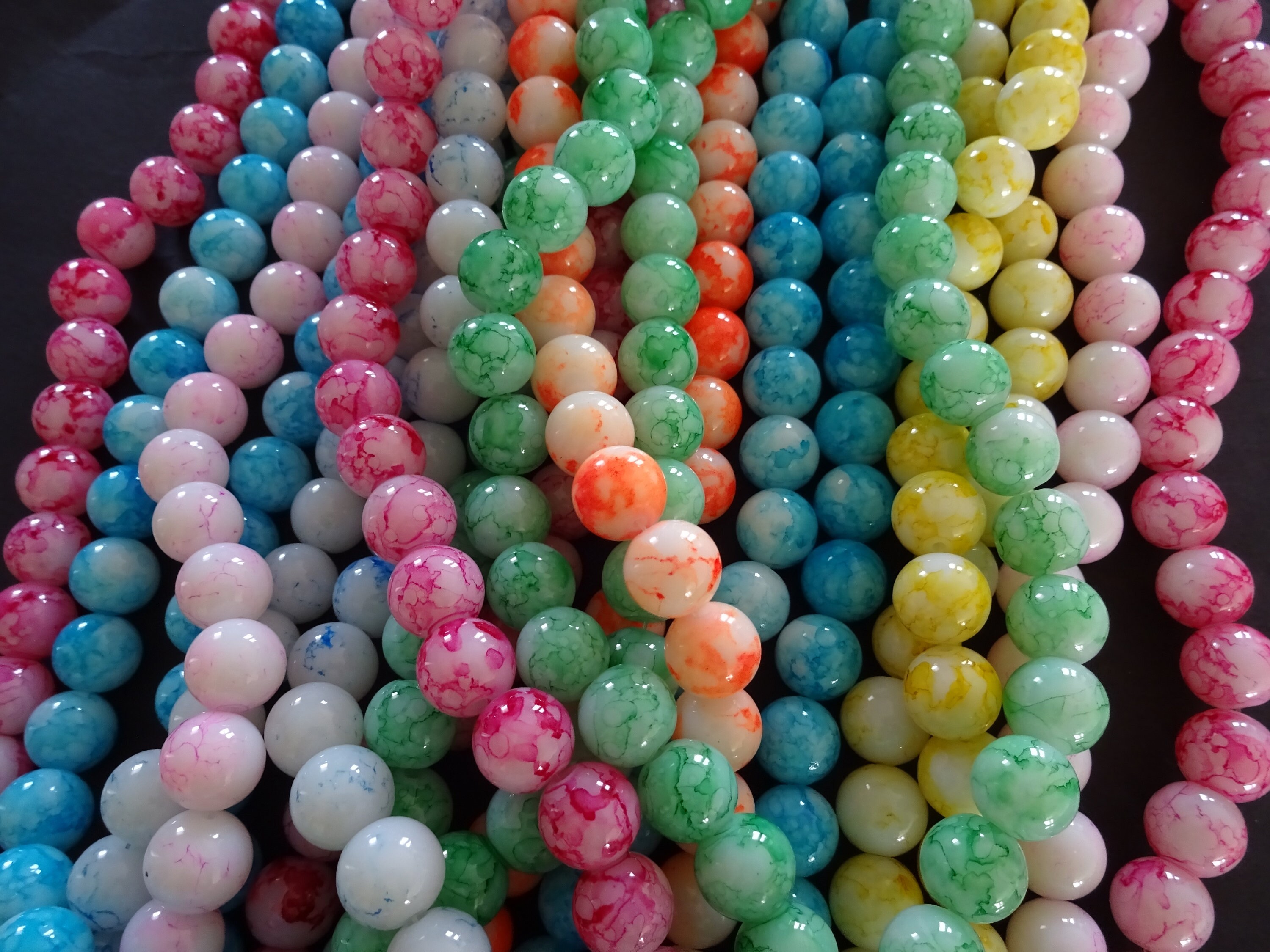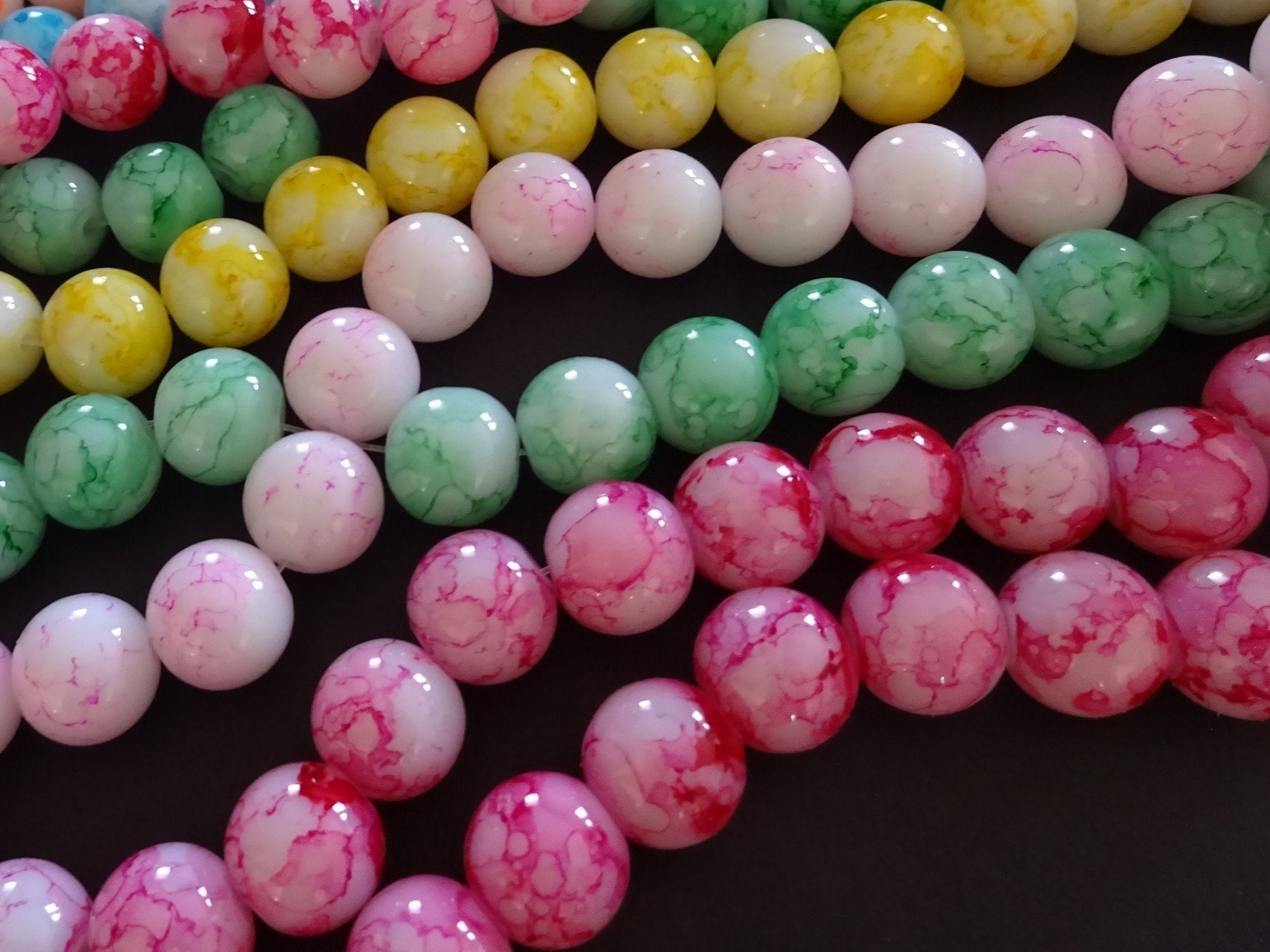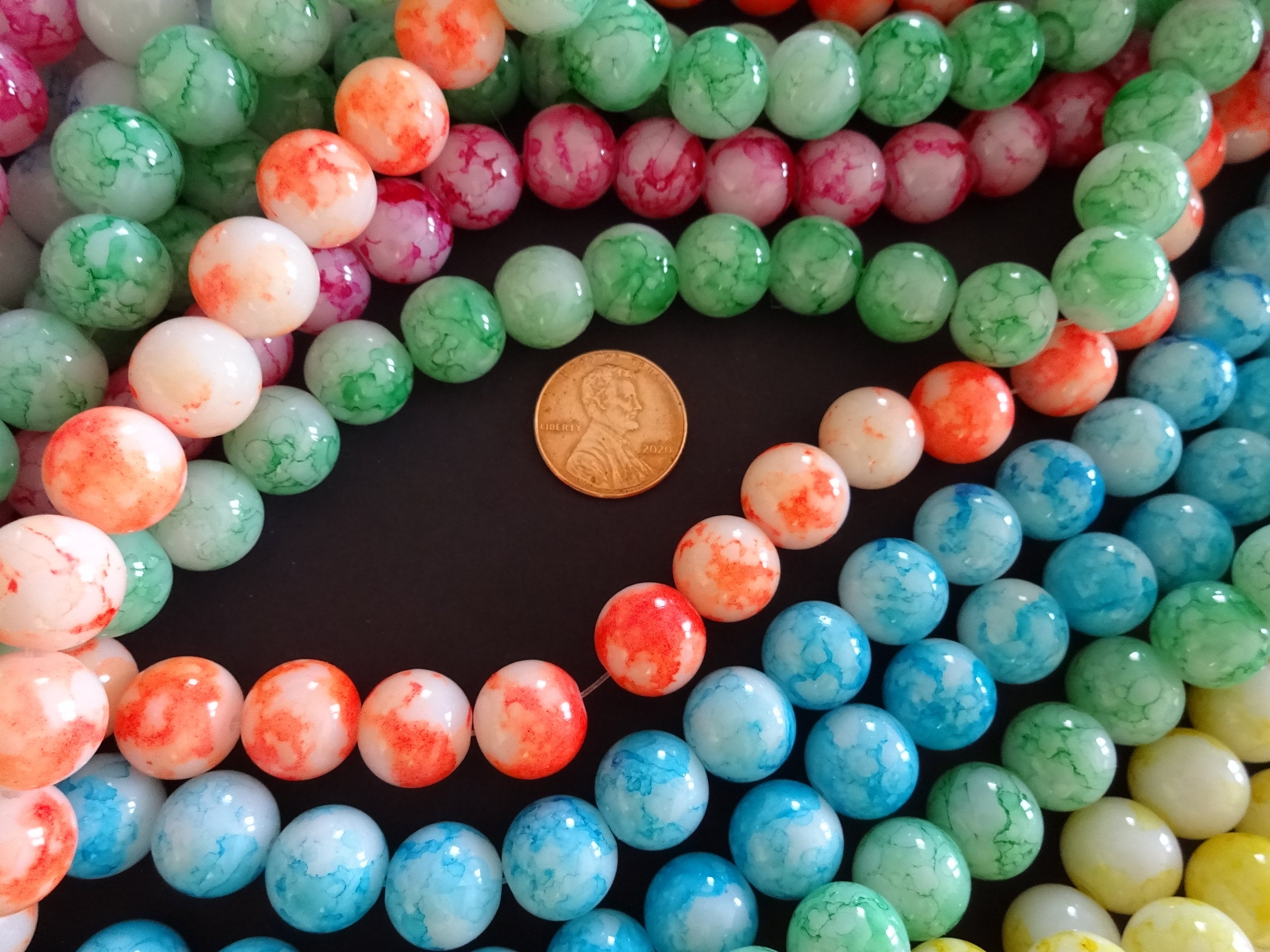 This listing is for a set of 5 random different color ball bead strands. Each strand is 31.4 inches with about 66 dyed 12mm ball beads. These colorful beads are great for creating your own fun and colorful pieces. The glass beads feature a beautiful marbled effect and have a great bright color.